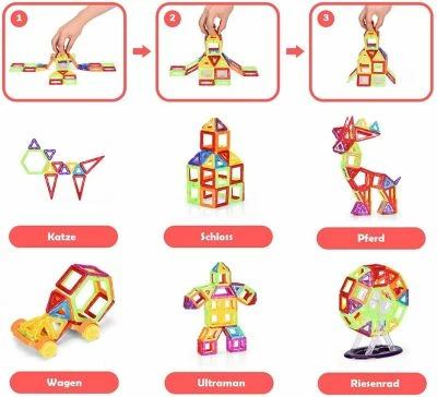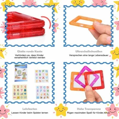 Magnetische Bausteine geben Kindern die besten Erinnerungen an ihre Kindheit. Diese magnetischen Spielzeuge haben ausgezeichnete magnetische und abgerundete Ecken für Sicherheit und Haltbarkeit. Wenn Kinder Spaß haben, können sie ihr Gehirn entwickeln, ihre Kreativität und Vorstellungskraft anregen und ihre praktischen und koordinativen Fähigkeiten verbessern. Bunte Farben erhöht die Farbempfindlichkeit von Kindern, interessantes Gameplay macht Eltern und Kinder intimer.