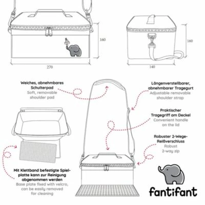 • Eine Klappe mit Klettverschluss hält die Spielplatte während des Transports. Die Platte kann zur Reinigung abgenommen werden