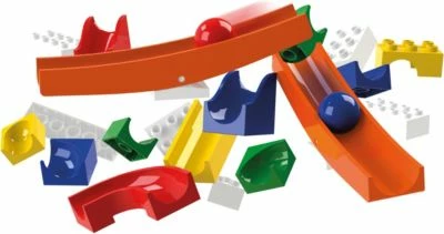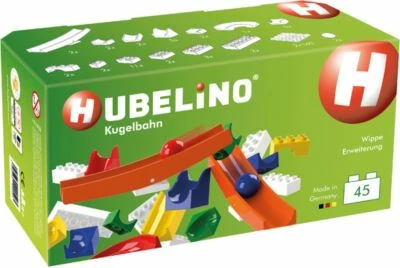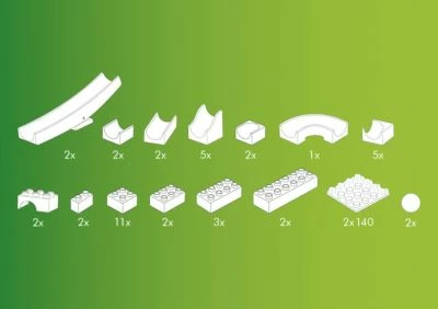 + Inhalt: 45 Teile (2 Wippen, 19 Bahnelemente, 20 Konstruktionsbausteine, 2 140er Platten, 2 Kugeln)