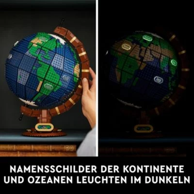 Der wunderbare Planet Erde kann nun von Bau-Fans mit diesem umfassenden Set LEGO® Ideas Globus (21332) im Retro-Look konstruiert werden. Das spektakuläre Ausstellungsstück wurde von einem Fan-Designer entworfen und vom LEGO® Ideas Team umgesetzt. Die LEGO Technic Elemente ermöglichen es, die Erdrotation darzustellen und die im Dunklen leuchtenden Steine bezeichnen die Kontinente und Ozeane. Mit den Steinen des LEGO Systems lässt sich die Kugelform der Erde nachbilden. Dieses Bau-Projekt umfasst 2585 Bausteine, die mithilfe der bebilderten Anleitung Schritt für Schritt den Weg zueinander finden und dann als wahrer Hingucker in jeder Sammlung glänzen. Das baubare Schiff, der baubare Kompass und das Namensschild „The Earth“ vollenden den Blickfang für das Wohnzimmer oder das Büro.